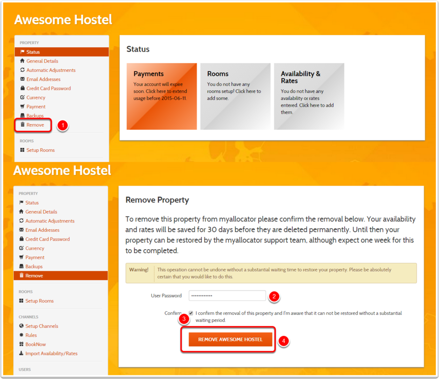 If you wish to separate the property from the account (for example when selling one of your properties) send a request to myallocator support explaining the situation and providing the new owner information.
